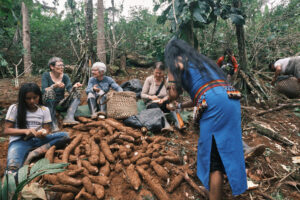 Journée autour de Nunkui, l’entité de la production ou l’énergie féminine : Les chevaux chargés, nous prenons la route pour une heure de marche afin d’atteindre les parcelles cultivables familiales. Chasseurs, cueilleurs et cultivateurs, les shuars ont une grande compréhension de la nature et des interactions qui la compose. A travers le langage des plantes, ils nous apprennent à semer, à planter et à récolter en chantant les « anents » (chants magiques) à Nunkui. Lors de cette journée de partage autour de la vie agricole, nous apprenons à cuisiner les récoltes ainsi qu’à élaborer la chicha. Cette boisson traditionnelle en Amazonie est principalement élaborée à base du manioc. Tout au long de la journée, les shuars s’en abreuvent. C’est à la fois une boisson et un aliment qui permet d’être rassasié et hydraté.