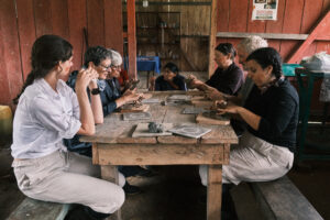 Journée autour de la vie artistique : accompagnés des femmes de la communauté, nous apprenons à réaliser différentes poteries et ustensiles utiles dans la vie de tous les jours. Nous partons d’abord récolter l’argile. Ensuite, nous apprenons à réaliser les ustensiles de notre choix sous les précieux conseils des femmes. Une fois séchées, nous aurons l’occasion de peindre nos propres réalisations avec différentes essences de la jungle avant de passer à la phase de cuisson. Cette journée permet d’échanger davantage avec les femmes et de plonger dans leur réalité. En fin de journée, nous participons à plusieurs chants shuars, un moyen de se connecter à l’entité Arutam dissimulée dans les cascades, représentant le vivant dans son ensemble.